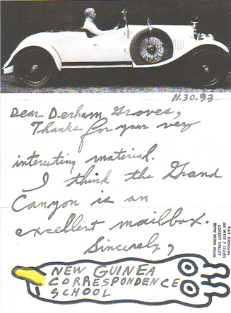 In 1993, while working on my book Mail Art: The Do-It-Yourself Letterbox From Workshop To Gatepost, I wrote to legendary U.S. artist Ray Johnson, the ‘father’ of mail art, seeking his views about homemade letterboxes. This is his reply, written in watercolour paint: